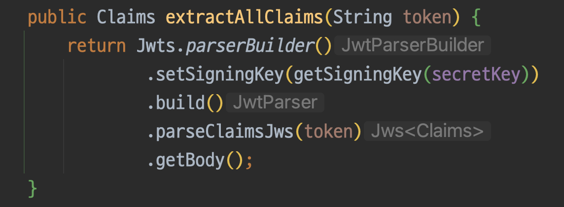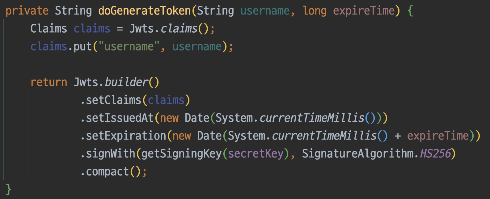 - jjwt 라이브러리를 통해 claim에 username을 설정하고 발행(iat), 만료시간(exp) 설정하고 JWT 토큰 생성