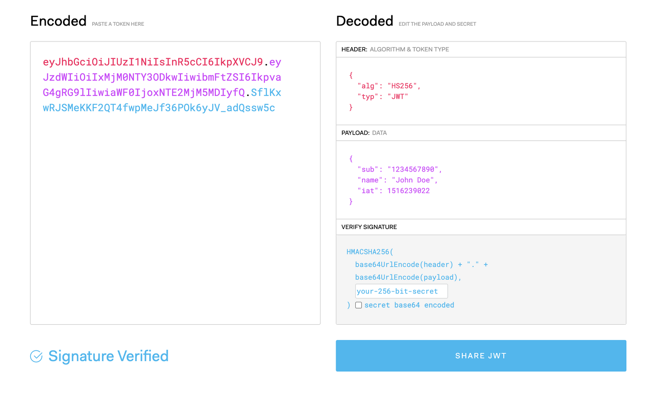 - Signature: 서버에서 해당 토큰이 유효한지 아닌지를 구분 할 수 있는 역할을 수행
