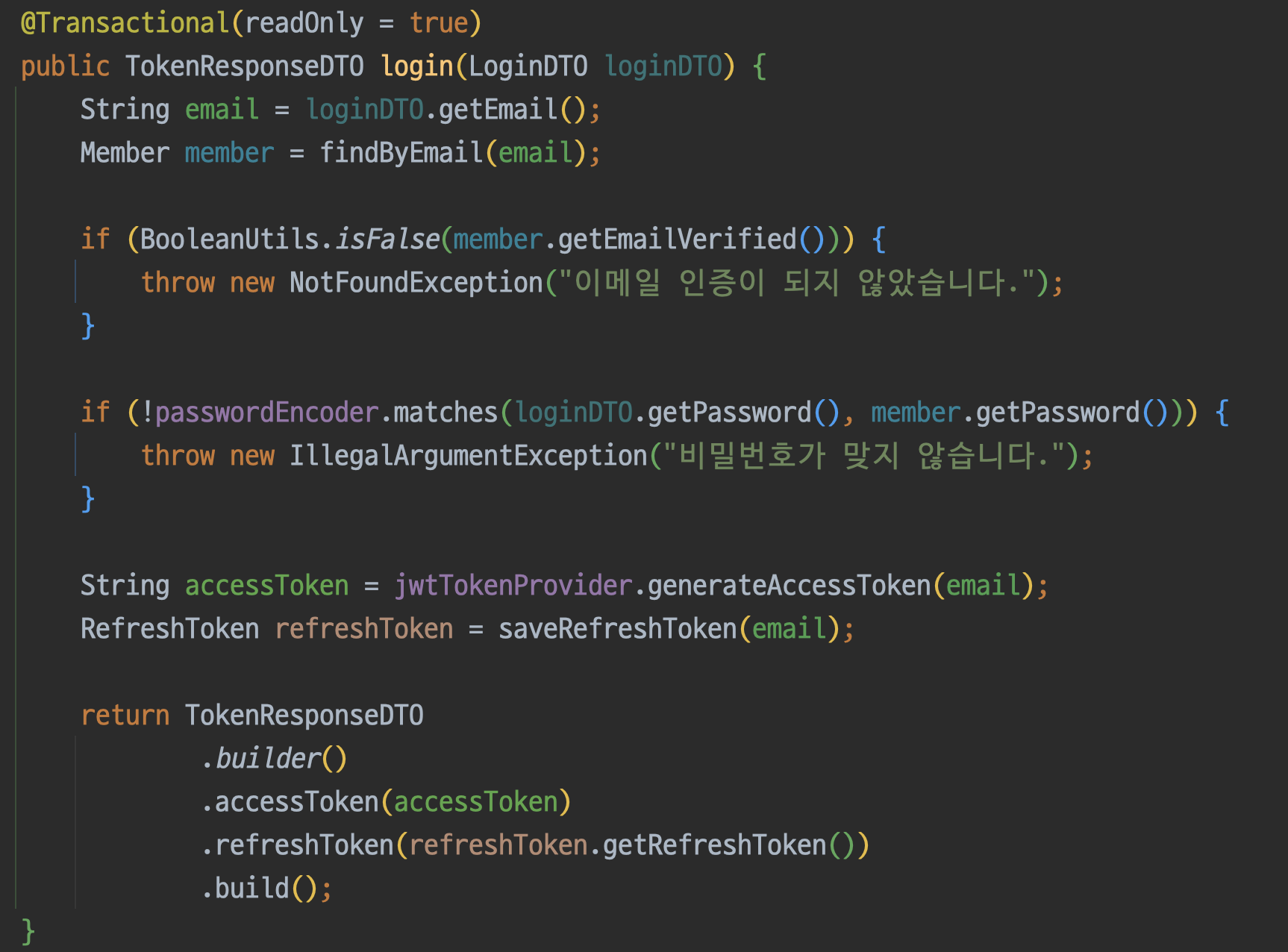 - 해당하는 유저가 존재하면 JWT 토큰(AccessToken, RefreshToken)을 생성